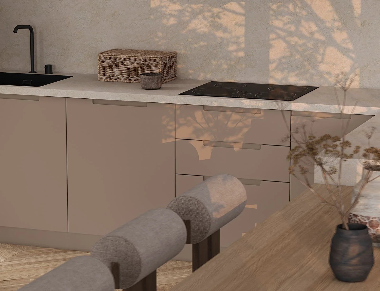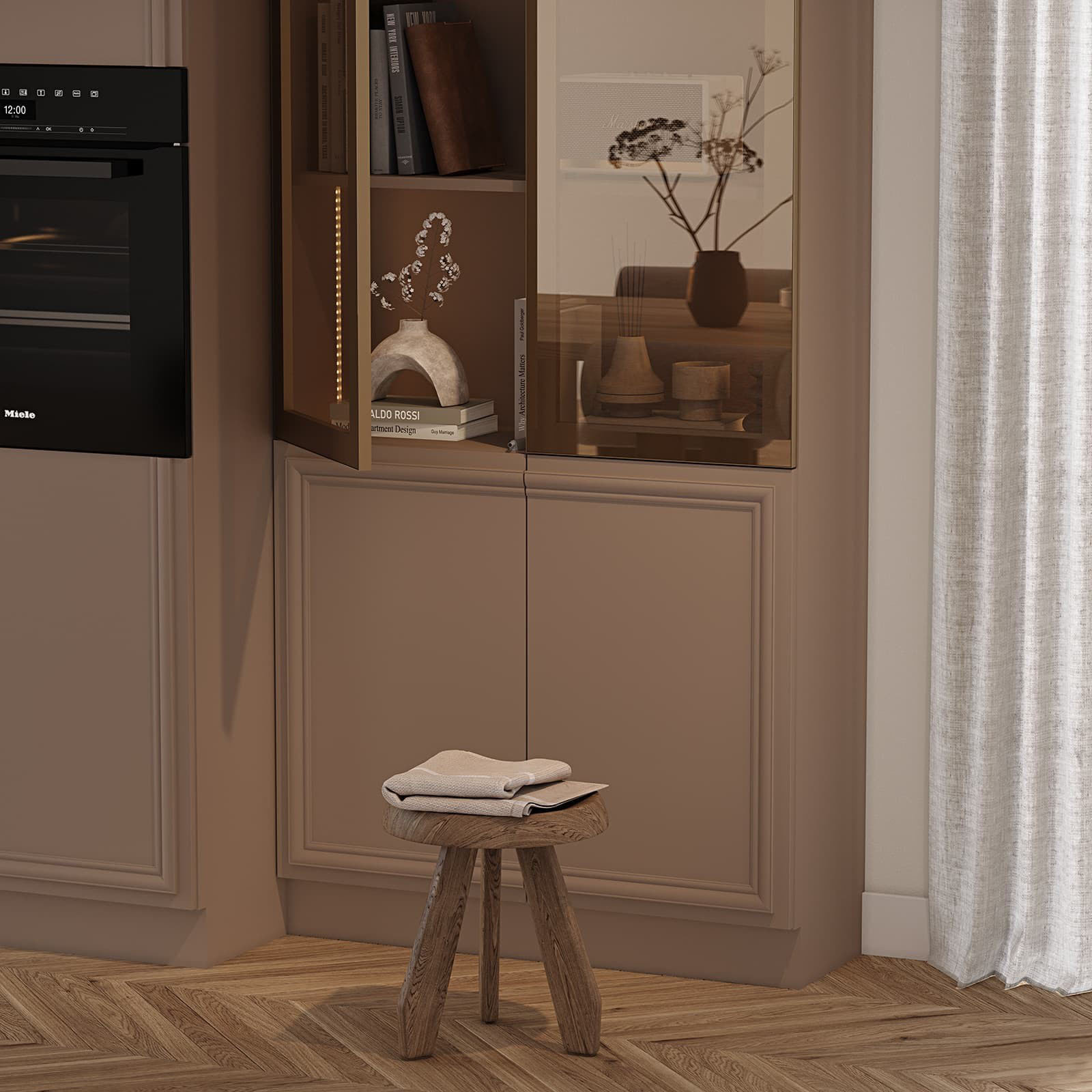 Fronts: T622 Lacquered MDF, T649 Lacquered MDF / solid alder wood, color NCS S 5005-Y50R Matt / NCS S 1500-N Matt