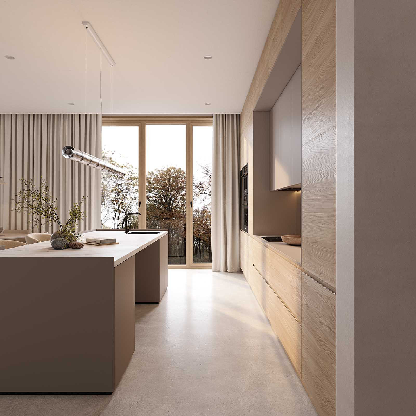 Fronts: acrylic Fenix NTM, color Grey Beige NTM (0748) / T422, T419G Oak wood veneer, color #189 (wax stain White)
