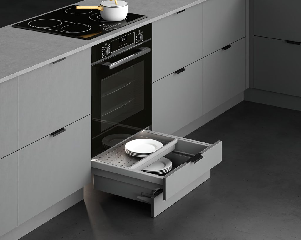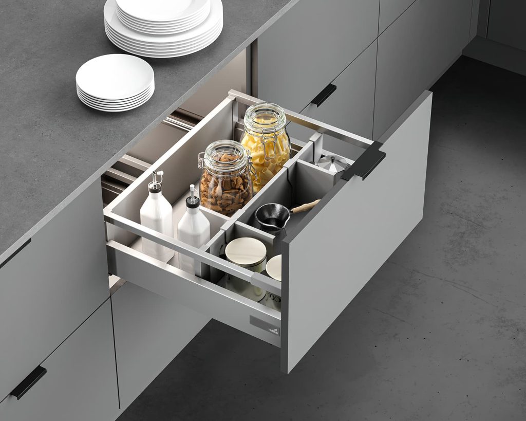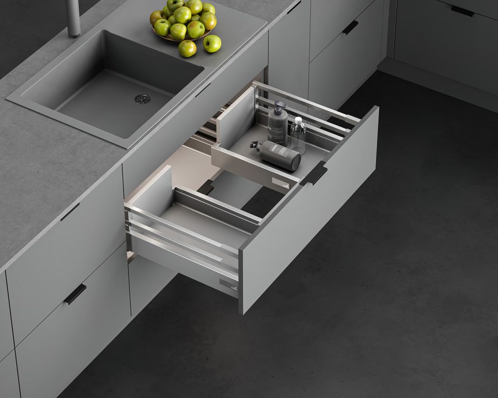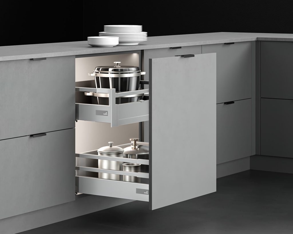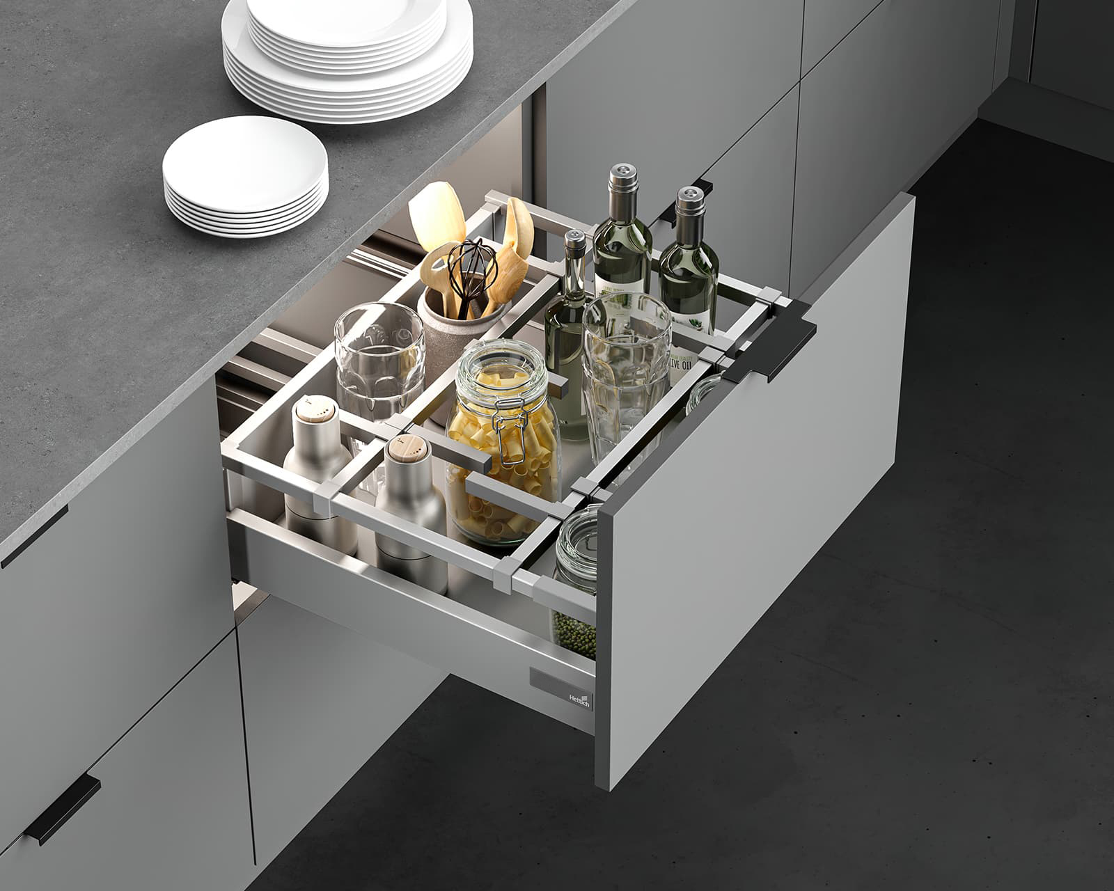 Internal organization with crosswise aluminum profile and lengthwise dividers for pot-and-pan drawer C with railing / internal pot-and-pan drawer C with railing / pot-and-pan drawer D with double railing