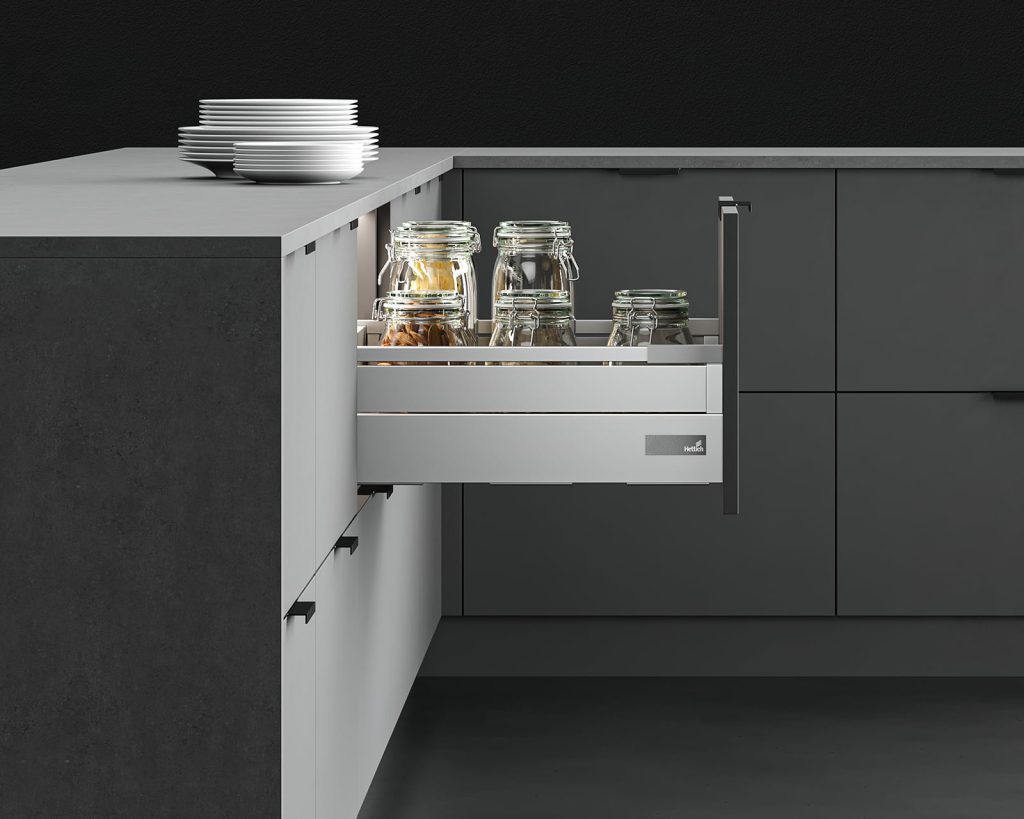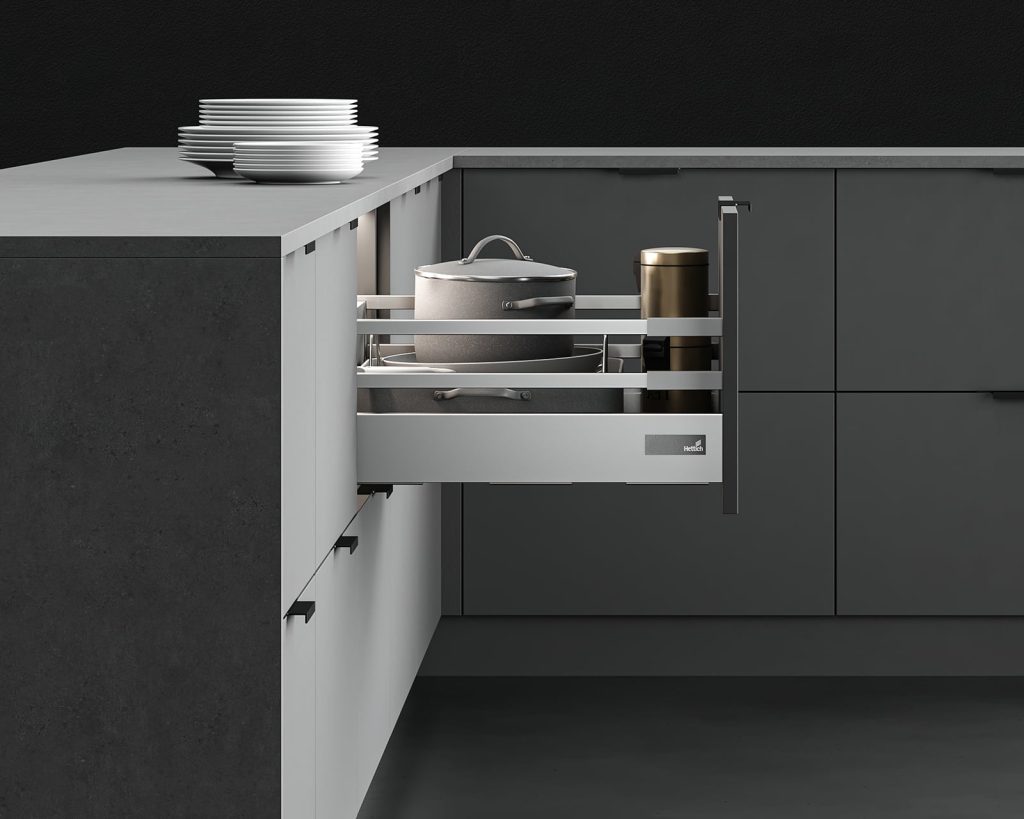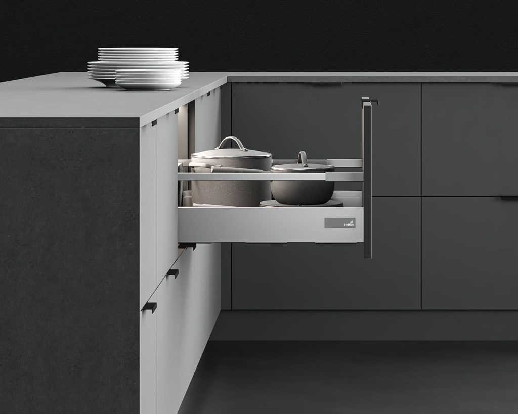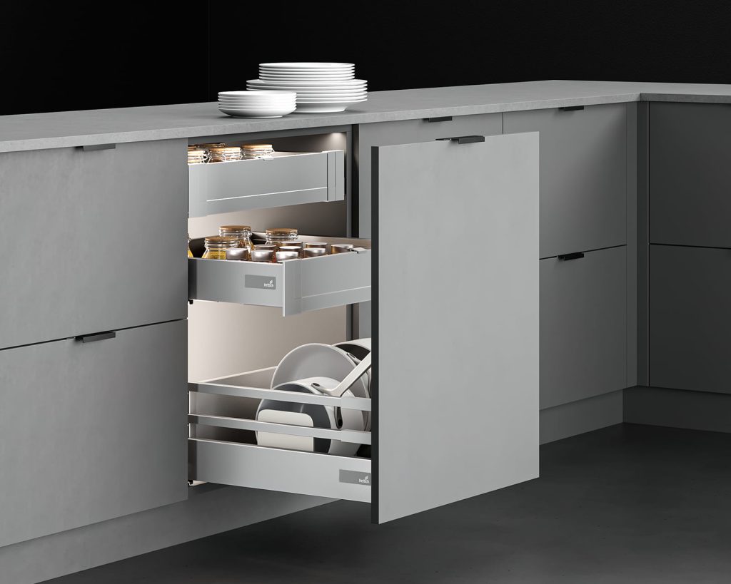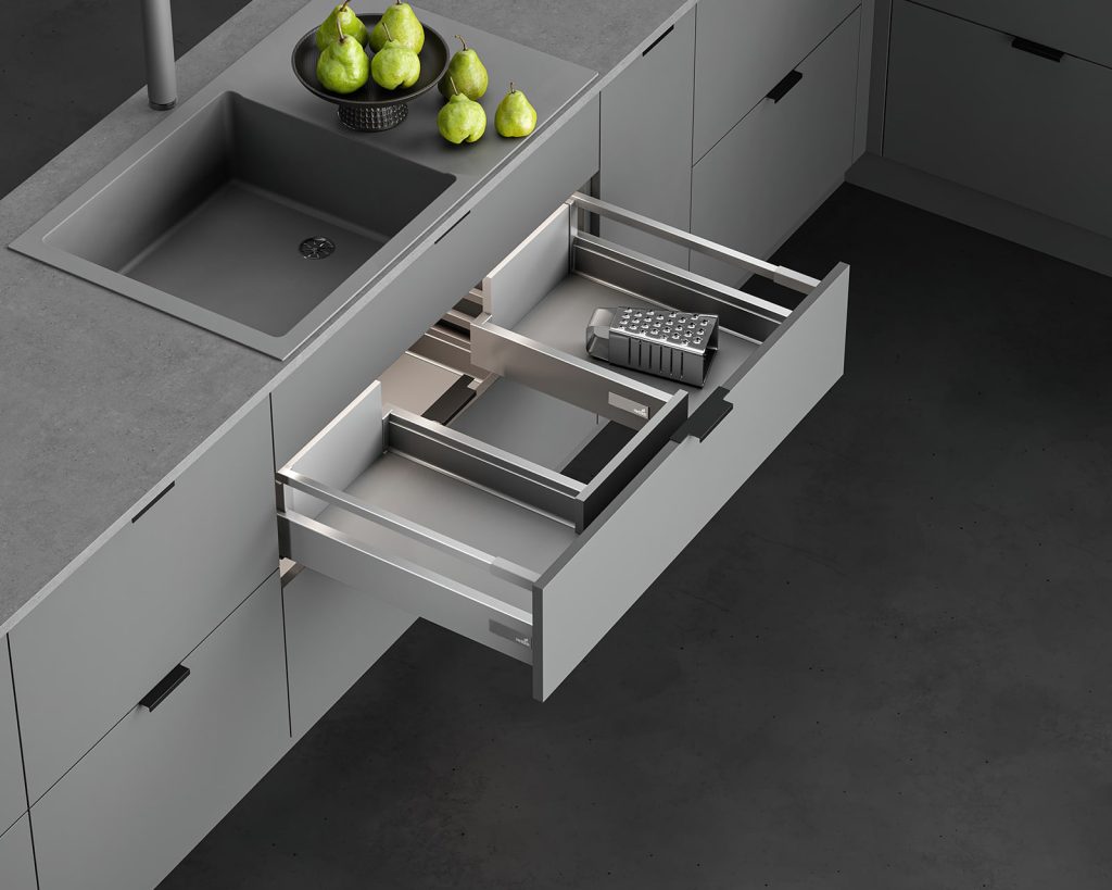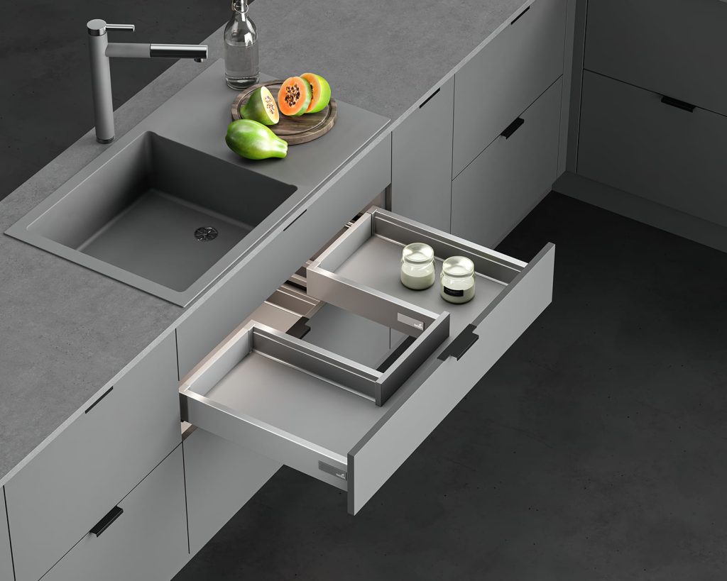 Internal organization with crosswise aluminum profile and lengthwise dividers for pot-and-pan drawer C with railing / internal pot-and-pan drawer C with railing / pot-and-pan drawer D with double railing